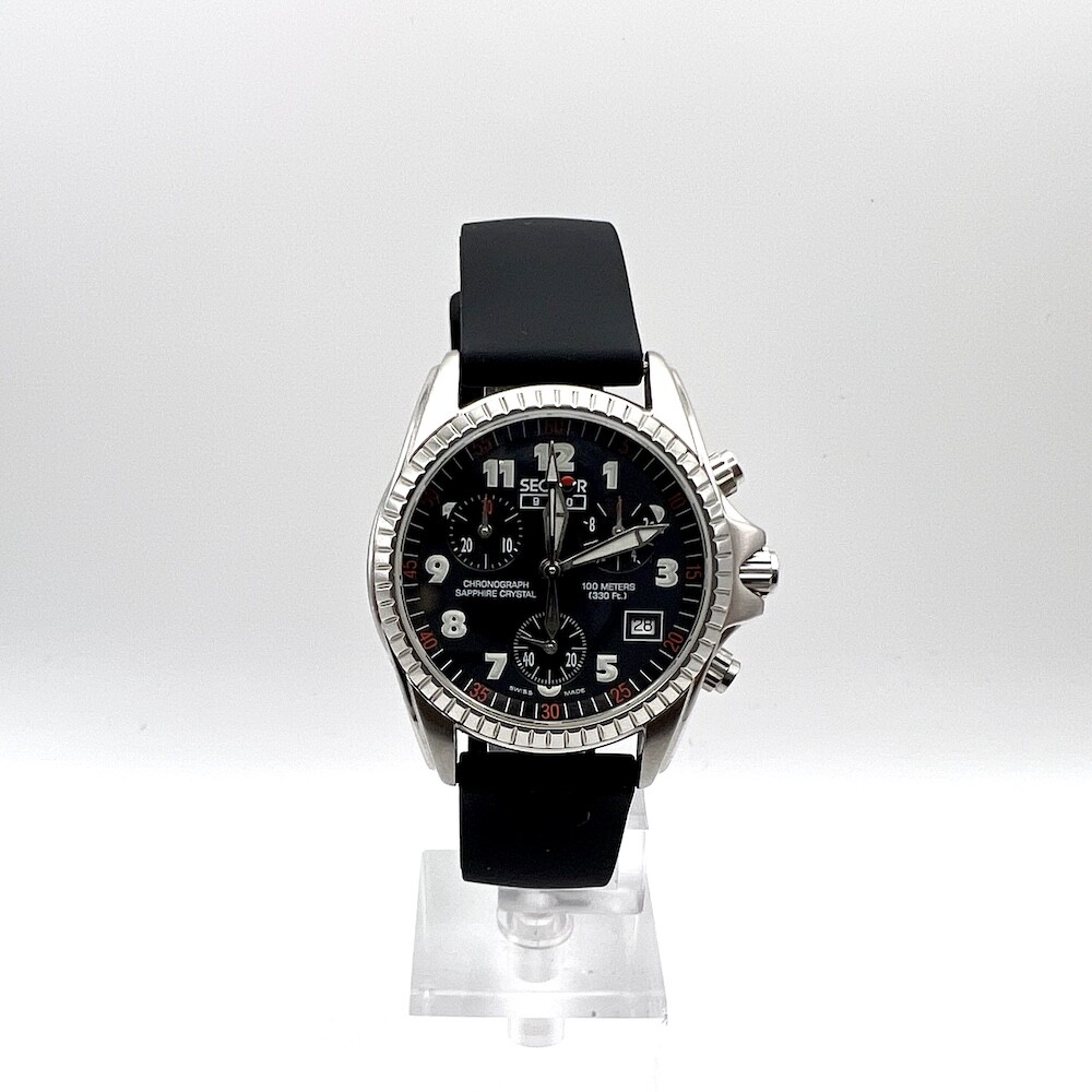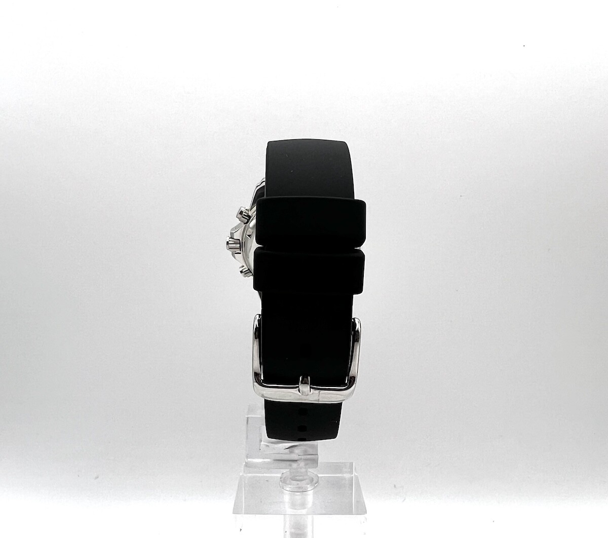 Cassa in acciaio diametro mm. 32, fondello a vite, corona a vite, vetro zaffiro, movimento crono svizzero al quarzo.