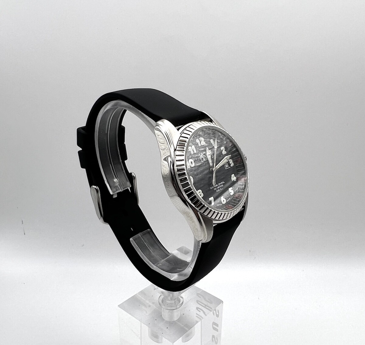 Cassa in acciaio diametro mm. 32, fondello a vite, corona a vite, vetro zaffiro, movimento svizzero al quarzo.
